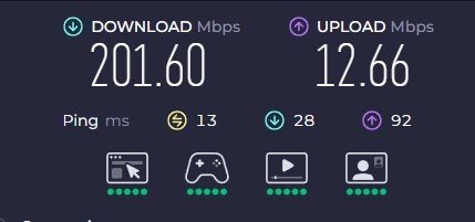 Toujours 200mbps et même 12mbps d'upload, avec un Ping de 13ms, 15ms maximum