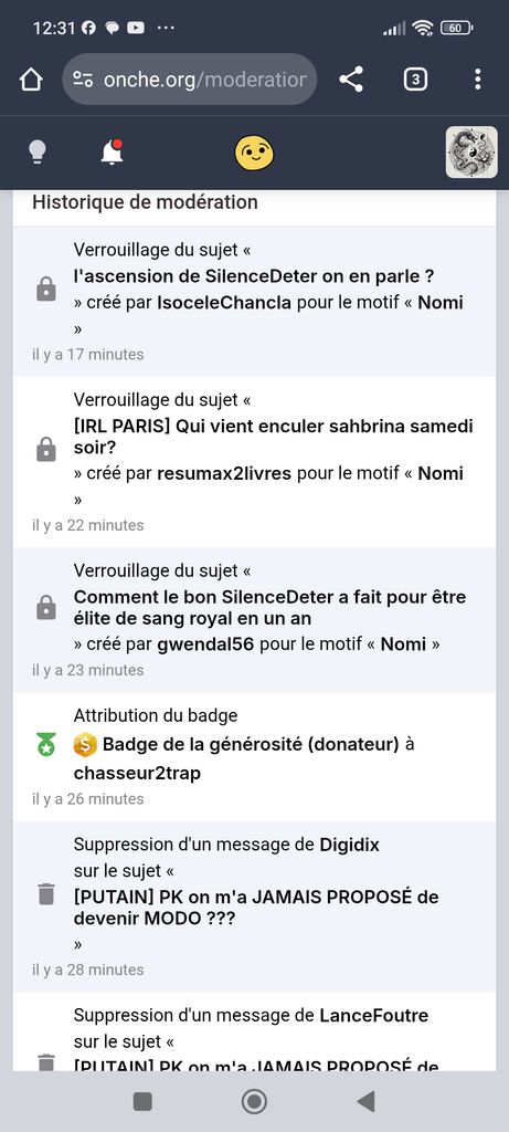 Non non non. Tu vas tout en bas consulter l'historique de modération, tu regardes le motif du blocage et tu nous dis.