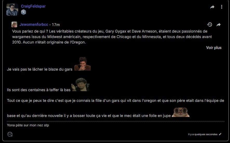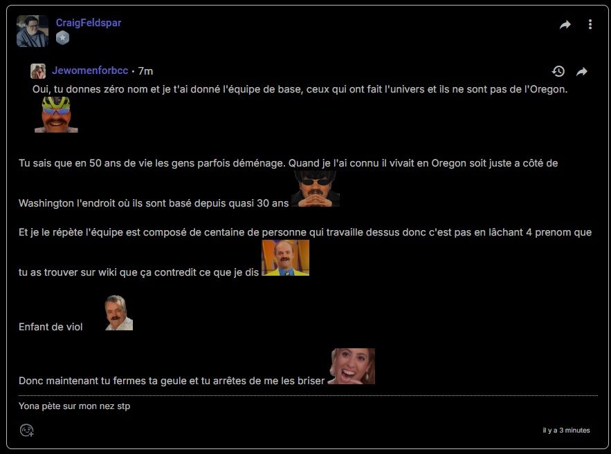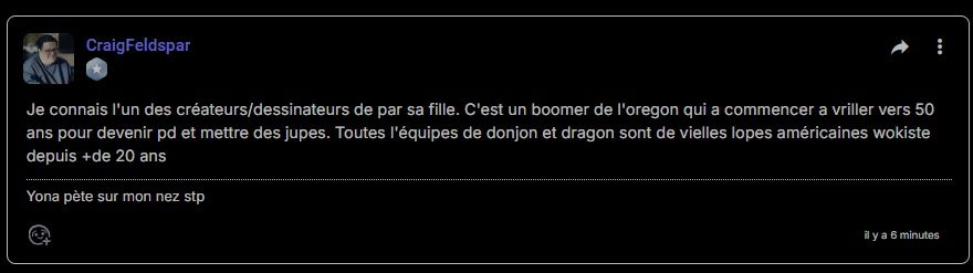 Que tu trouves des wokistes par la suite, bah logique, j'ai parlé de nouvelles équipes, le mec dont tu fais mention n'est pas un créateur phare, juste un type secondaire à l'univers, probablement un fan mais qui voulait faire autrement, comme il y a eu des nouvelles équipes, le wokisme a pris par la suite. Le mec d'Oregon aurait participé ou pas, l'univers ne provient pas de lui.