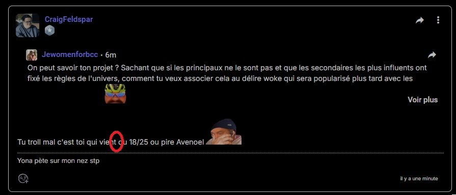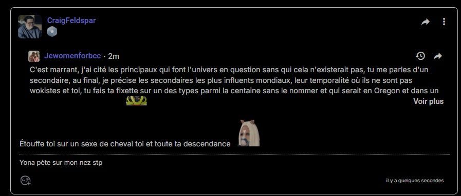 Sauf que si tu te mets à ma place, genre, on te parle de faire un acte zoophile et qu'on souhaite ta mort, tu vois ça comme un drama de juste indiquer à un modo le souci ?