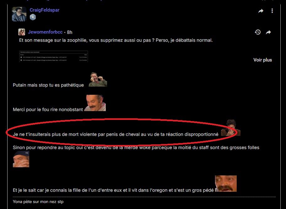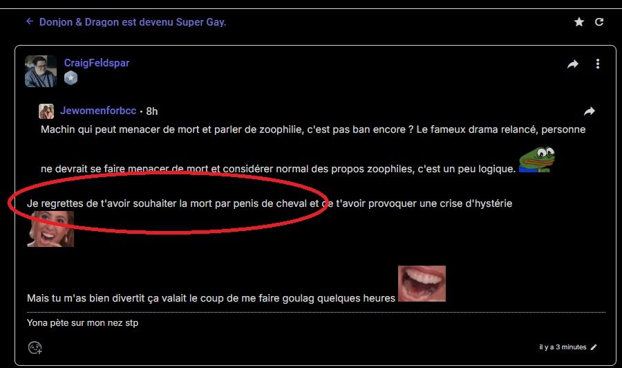 Sauf que si tu te mets à ma place, genre, on te parle de faire un acte zoophile et qu'on souhaite ta mort, tu vois ça comme un drama de juste indiquer à un modo le souci ?