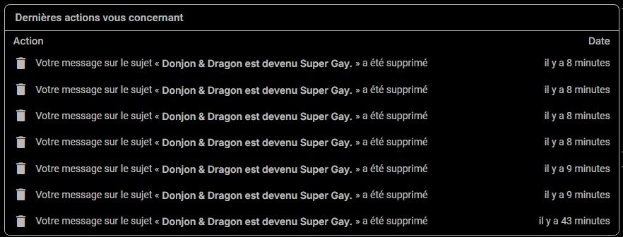 A aucun moment j'étais dans l'invective au moment où tu as dit enfant de viol puis ton délire de vouloir ma mort, tu pouvais juste donner ton avis normalement... Surtout qu'en plus, je demandais juste que tu nous dises le nom de la personne, je ne vais pas harceler une personne qui serait woke dans cet univers mais je suis revenu sur la temporalité et j'ai juste mis en évidence que du début et pendant des décennies, l'univers n'était pas wokiste pour les créations les plus populaires de donjon & dragon, d'ailleurs, l'op le voit aussi l'évolution wokiste...