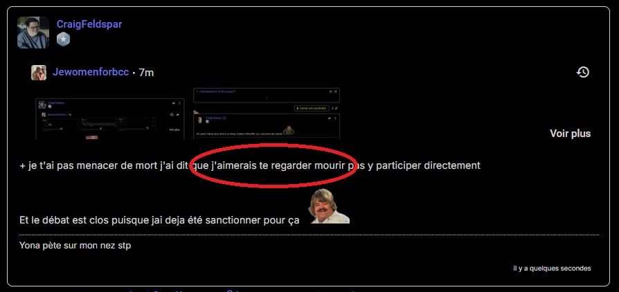 + je t'ai pas menacer de mort j'ai dit que j'aurais eu aimer te regarder mourir ( au conditionnel de façon imagé ) pas y participer directement