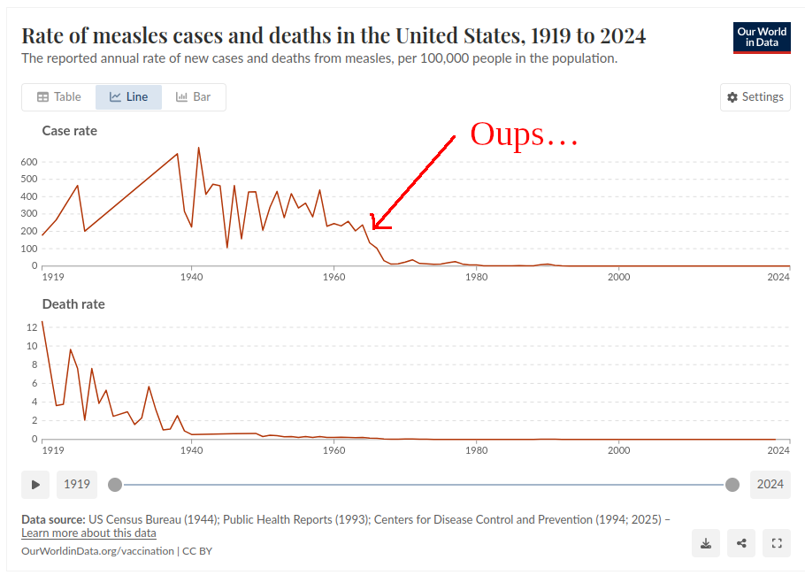Donc oui, la médecine moderne savait faire en sorte que les loupiots arrêtent de mourir de la rougeole, mais c’est bien le vaccin qui a éradiqué la maladie.