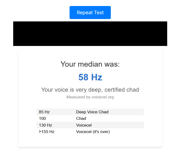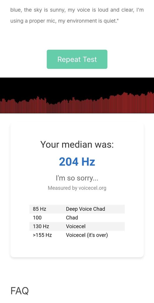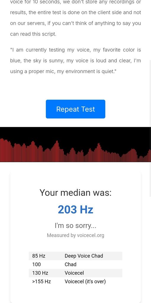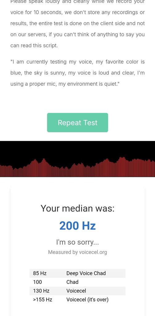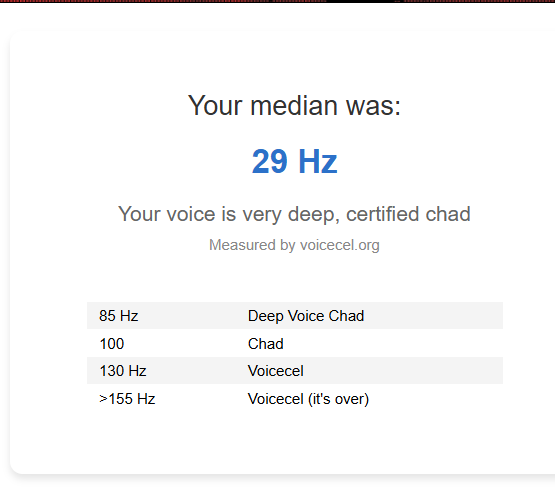 après t'es pas obligé hein, c'est jsute que normalemeent les micros de téléphones sont assez précis pour détecter les fréquences donc normalememt le test est plutôt précis apres je penses pas que le delire chad voicecell soit vraiment réel genre c'est pas à prendre au sérieux, c'est pas parce que t'as une voix qui a une moyenne un peu aigue que tu n'es pas un chad en fait