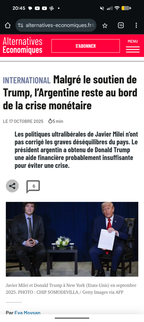 Alternative économique est un media de gauche donc forcément ils critiquent le libéralisme, mais que vous me vouliez ou non, mais l'Argentine se porte bien mieux depuis Milei, la dette et réduite, l'inflation aussi, le taux de pauvreté diminue, les salaires augmentent, le gouvernement est en accédant budgétaire (ce que n'a pas connu la France depuis 1974), donc bon.