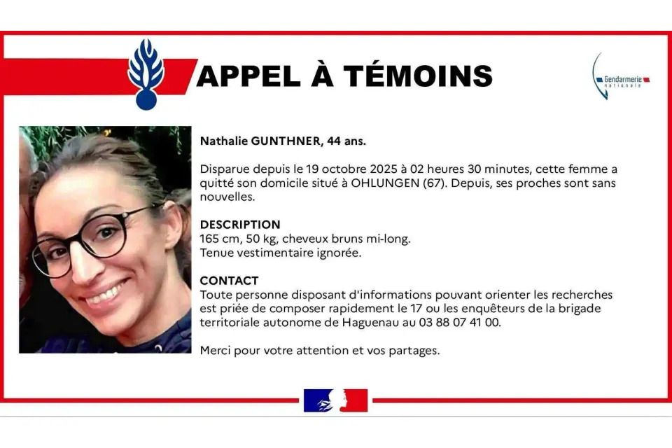 La gendarmerie prend très au sérieux la disparition de la jeune femme et ce lundi 20 octobre au matin un appel à témoins pour tenter de la retrouver. Nathalie Gunthner a 44 ans, mesure 1,65 m et 50 km, elle porte les cheveux bruns mi-longs. Sa tenue vestimentaire au moment de sa disparition n’est pas connue.