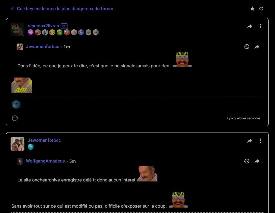 Dans les groupes de khey que je fréquentais IRL les plus gros tarax étaient toujours ceux qui efface avec soin leur messages et qui enregistre TOUT. Tout les éléments qui peuvent être retenu contre toi sont dans une clé usb ou un dossier de leur ordinateur. Le gars doit avoir un dossier par forumeur