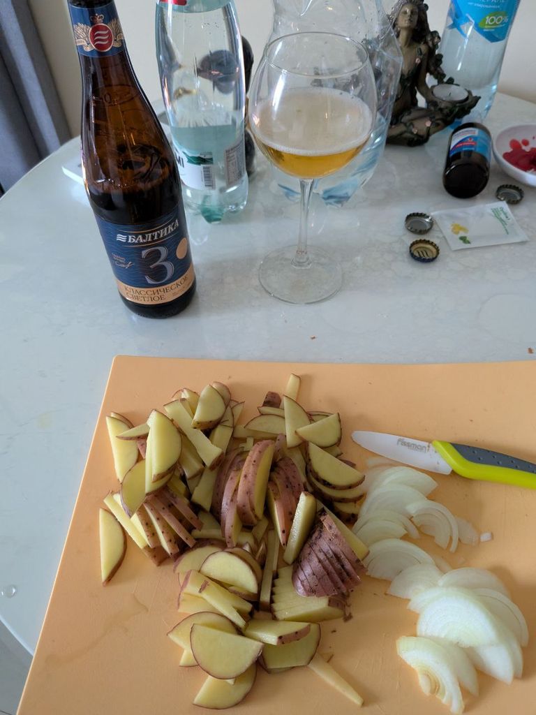 1. Couper les pommes de terres + oignons, galere avec le knife mais il passe les xray c le +