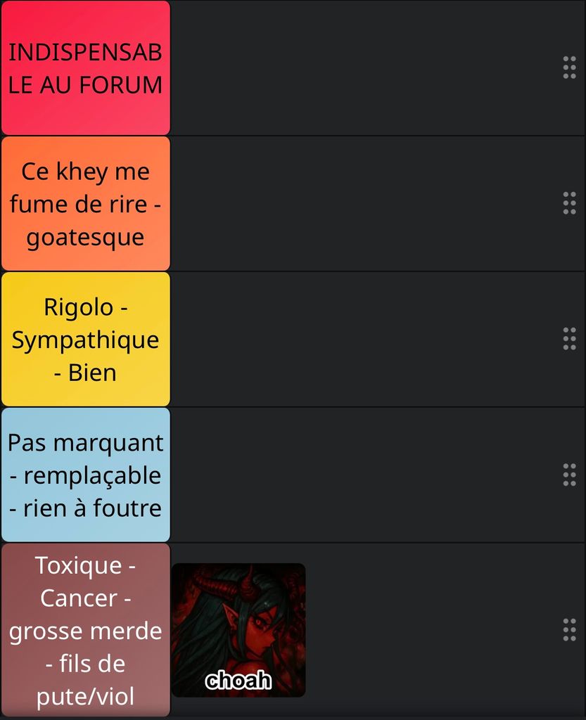 Ne prenez ni au sérieux ni personnellement les listes, on reste bon délire sur le forum Onche.org