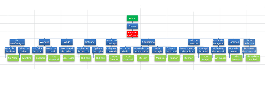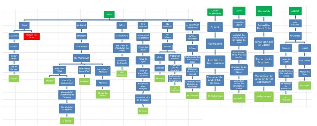 Le problème est que même si on le considère comme faible, les hadiths sont transmis par des TONNES de personnes et PAS seulement par Hicham. Voici un schéma résumant les personnes qui n'ont PAS transmis les hadiths de Hicham Ibn Urwa :