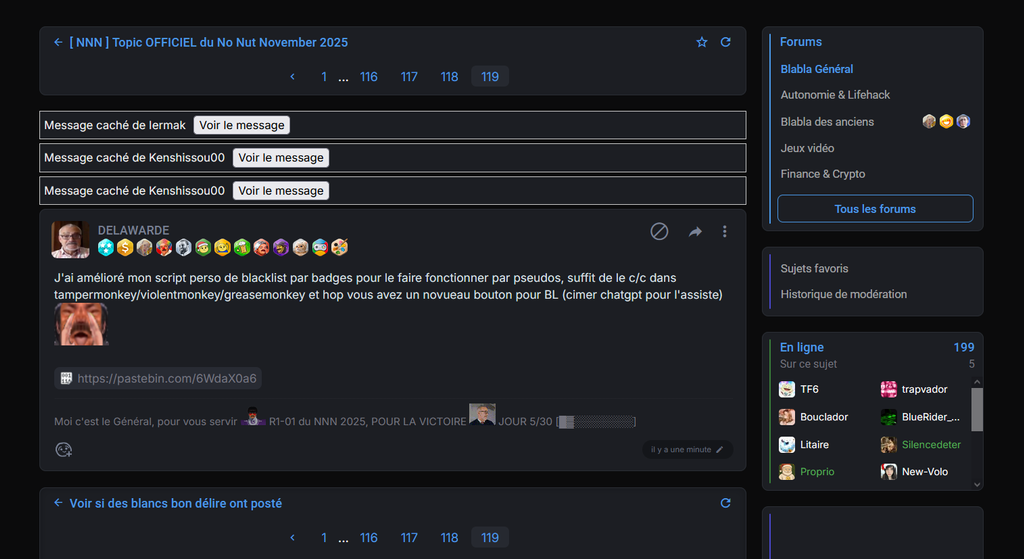 J'ai amélioré mon script perso de blacklist par badges pour le faire fonctionner par pseudos, suffit de le c/c dans tampermonkey/violentmonkey/greasemonkey et hop vous avez un nouveau bouton pour BL (cimer chatgpt pour l'assiste)