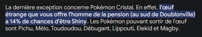 Moi j'ai eu un magby shiny sans même le vouloir dans l'oeuf de la pension dans pokémon crystal, celui qui te donne un bébé pokémon aléatoire