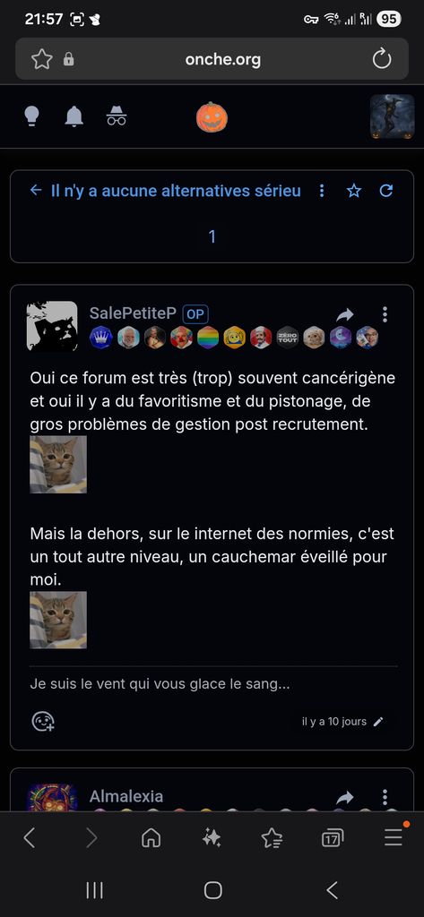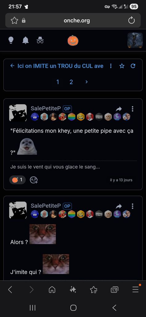 Ce que je remarque c'est que la fois ou yodafeet est venu m'insulter gratuitement tot le matin en étant bourré ou sous médoc il avait bien discuté quelque heures avant avec salepetitep qui regardait avec beaucoup d'amusement son confrère se ridiculiser (on pouvait le savoir présent et mort de rire sur certains topic en voyant les réactions).