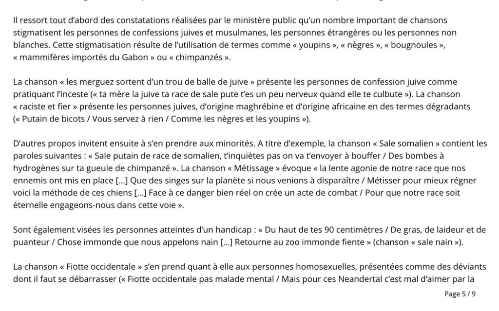 La chanson <<< les merguez sortent d'un trou de balle de juive >> présente les personnes de confession juive comme pratiquant l'inceste (< ta mère la juive ta race de sale pute t'es un peu nerveux quand elle te culbute »). La chanson <<< raciste et fier >> présente les personnes juives, d'origine maghrébine et d'origine africaine en des termes dégradants (<< Putain de bicots / Vous servez à rien / Comme les nègres et les youpins >>).