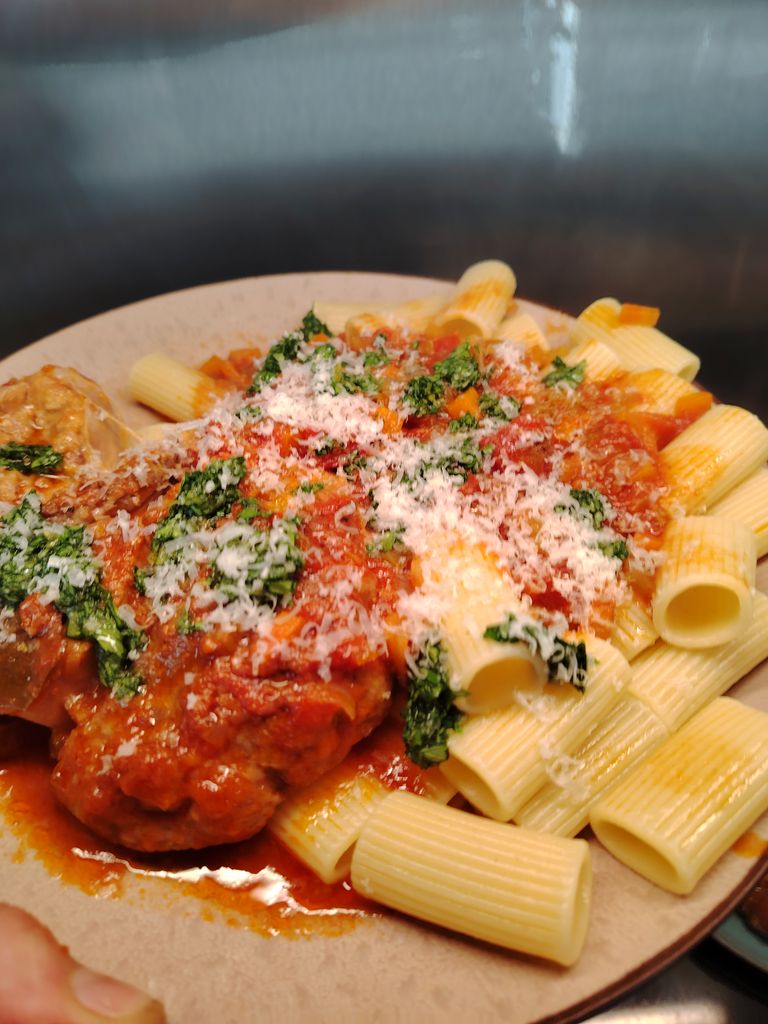 Osso bucco de veau mijoté 2h dans sa sauce tomate à base d'oignons, carottes et céleri, deglacé au vin blanc, accompagné de pâtes al bronzo al dente et sa gremolata, qui est une purée de persil à l'ail et aux zestes de citron montée à l'huile d'olive