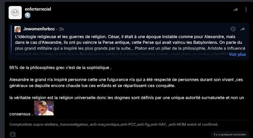 Le problème occidental vient de son importation migratoire non occidentale, de la propagande de déconstruction, de la tolérance en des religions concurrentes et de la corruption financière au profit d'un projet oriental israélien face aux impérialismes islamiques. Est-ce que le fait de suivre telle religion a démontré que le dieu musulman de tel dogme est vrai ? Pour les juifs pareil ? C'est pas Yahvé, mais des diasporas dans divers pays avec des lobbyistes détournant des moyens pour un agenda que le groupe religieux juif n'a pas réussi avant les révolutions où ils ont eu par la suite de l'influence, dont Rothschild est le plus connu en relation avec le pape Grégoire XVI et plus récemment, avec le pape François. Tous les camps religieux ont subi des défaites aussi, on a pas eu d'historiens parlant d'anges qui viennent et durant les deux guerres mondiales non plus. On voit surtout des conflits pétroliers, des déplacements migratoires, de l'usure, ce n'est pas le fait de quitter une religion, vu que plusieurs religions sont tolérées par la république maçonnique, c'est surtout l'ingérence pour un projet oriental qui pose un souci sur les priorités locales de l'Occident et de la Russie, dont on voit que le conflit ukrainien est aussi un prétexte de conflit avec des détournements de fonds en milliards par l'UE à plusieurs reprises. On a bien vu que Macron, Zelensky, Trump, Poutine, tous ont des liens avec la juiverie et ont fait de la propagande pour les religions. Quand on parle d'identité ethnique, c'est important d'y songer parce que vous prenez le cas des Kurdes en Orient, les juifs comme BHL les utilise contre les peuples divers orientaux selon tel conflit entre les musulmans ou encore, les tas de conflits ethniques et religieux dans le Sahel. Ce n'est pas une question de religion mais de gestion interne. Au lieu de suivre une religion, autant prouver qu'un dieu ou plusieurs gèrent l'univers. On arrive facilement à dire que les dieux incas, les pratiques vaudous, etc., c'est bidon, pourquoi les religions abrahamiques seraient plus crédibles ?