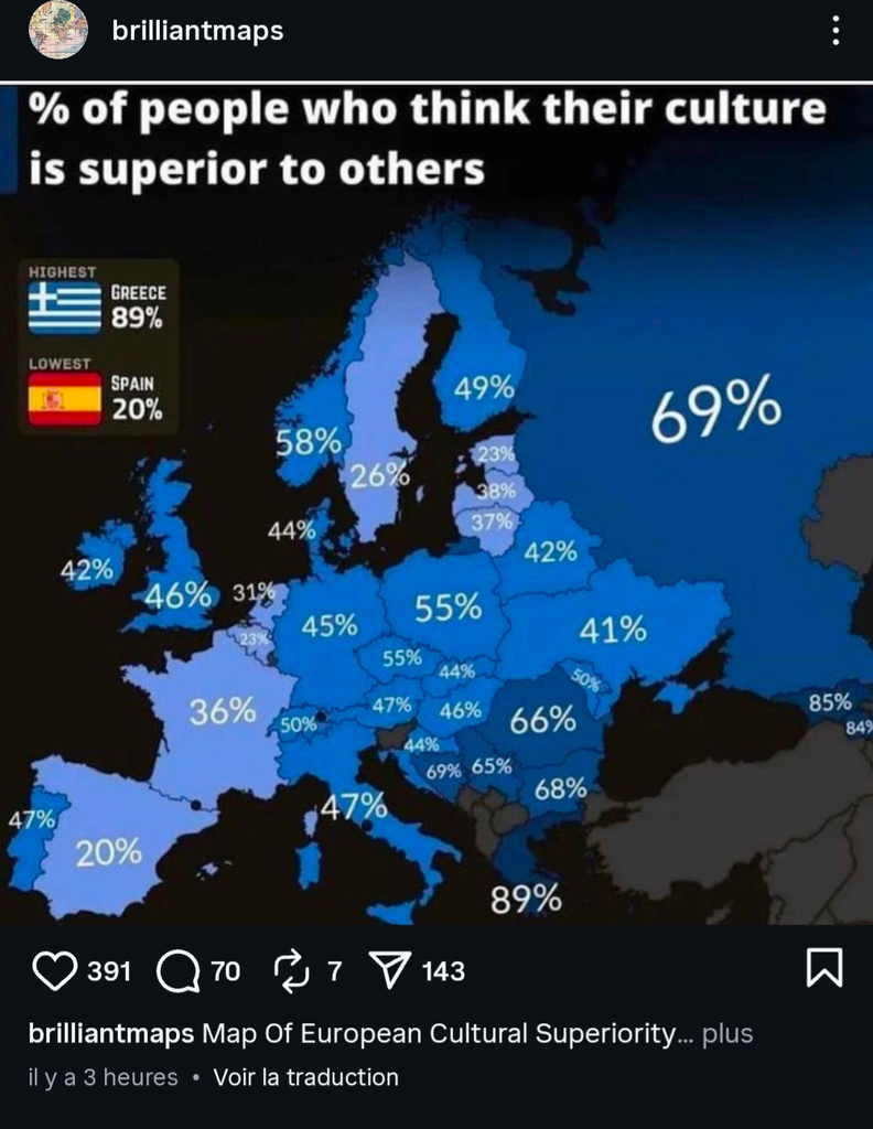 Le système a réprimé les français, en leur disant qu'ils avaient pas le droit d'être fiers de leur culture, de leur histoire, de leurs traditions, car c'est vu comme quelque chose de rétrograde, et même comme un relent suprématiste. La France n'est plus que la caricature d'elle même et culturellement elle pèse moins qu'avant, bien qu'elle reste organisatrice d'évènements culturels d'importance planétaire (JO, défilés de mode, coupes du monde de sport, festivals etc). C'est triste.