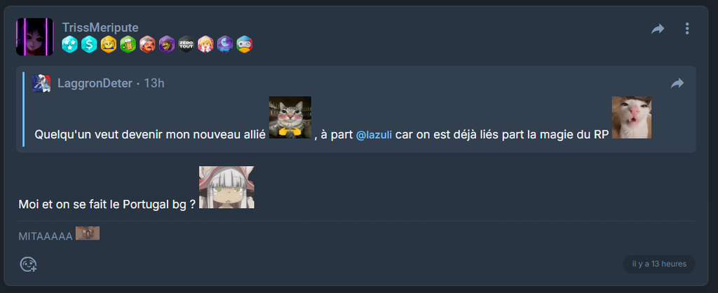 T'es gonflé quand même, j'étais tout seul contre les Ottomans à un moment quand même, j'ai demandé de l'aide et t'es pas venu alors que tu fais un RP qui devait t'obliger à m'aider, voire à soutenir une croisade