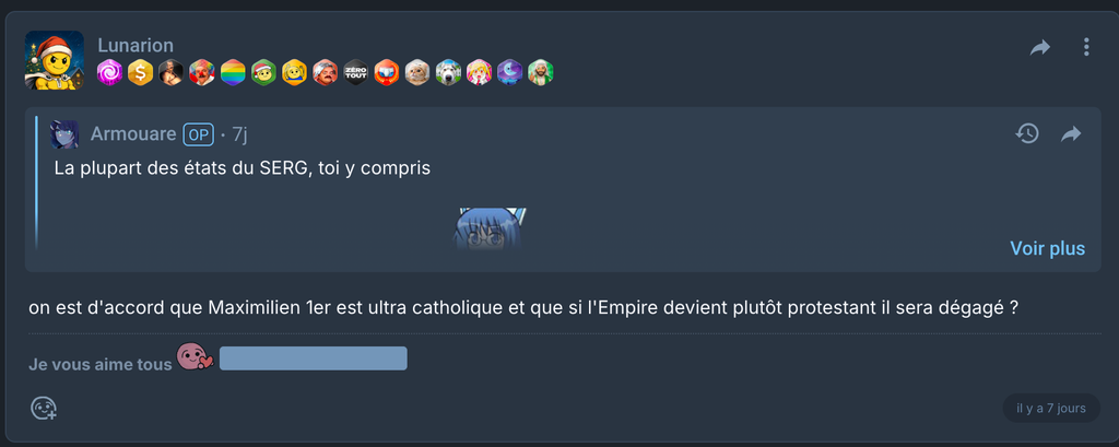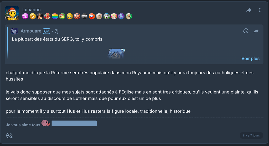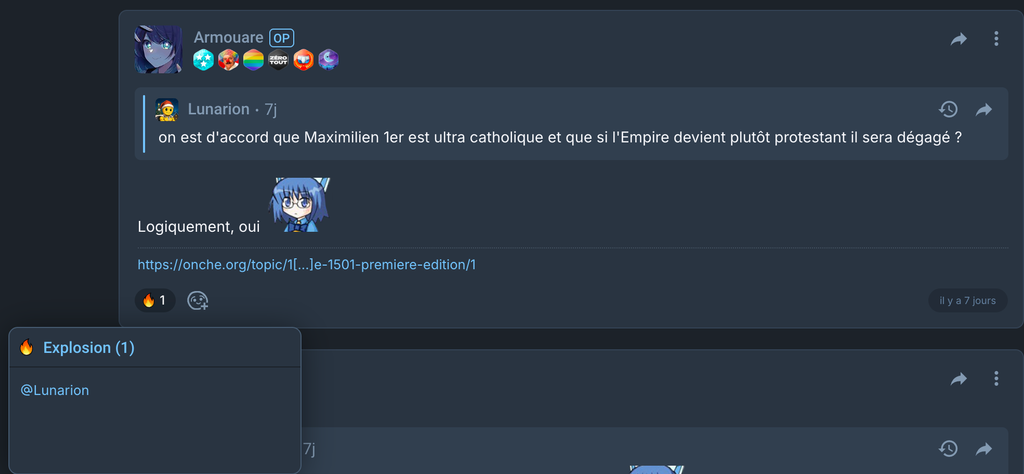 Je suis contre toi, et tu es contre moi. Tu n'étais pas là au début mais dès le tour 1 Maximilien 1er a revendiqué mon trône, et toi dès ton premier tour tu voulais comploter contre moi pour me renverser. Mon opposition est légitime.