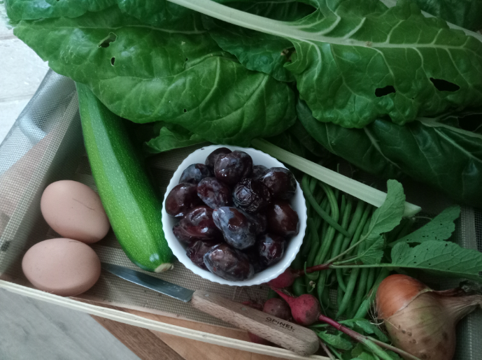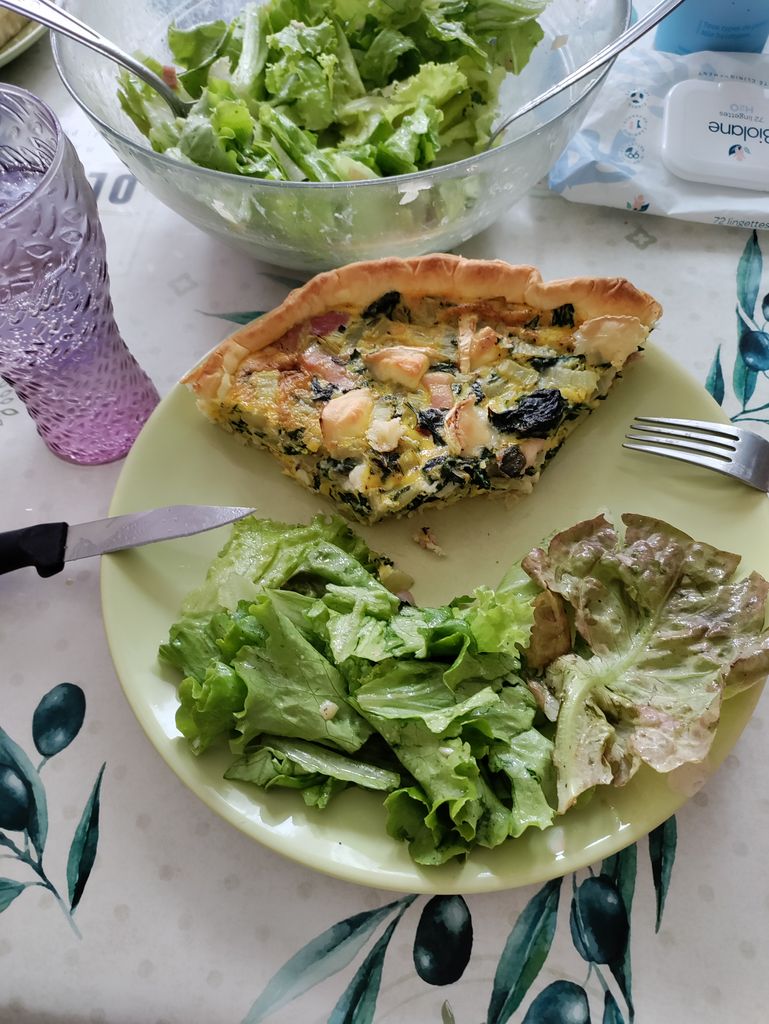 Quiche aux blettes, oeufs du jardin, chèvre, poitrine fumée