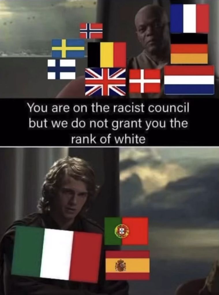 En gros les pays du haut disent que les 3 pays d'en bas sont dans le clan des racistes mais qu'ils ne sont pas considères comme blancs