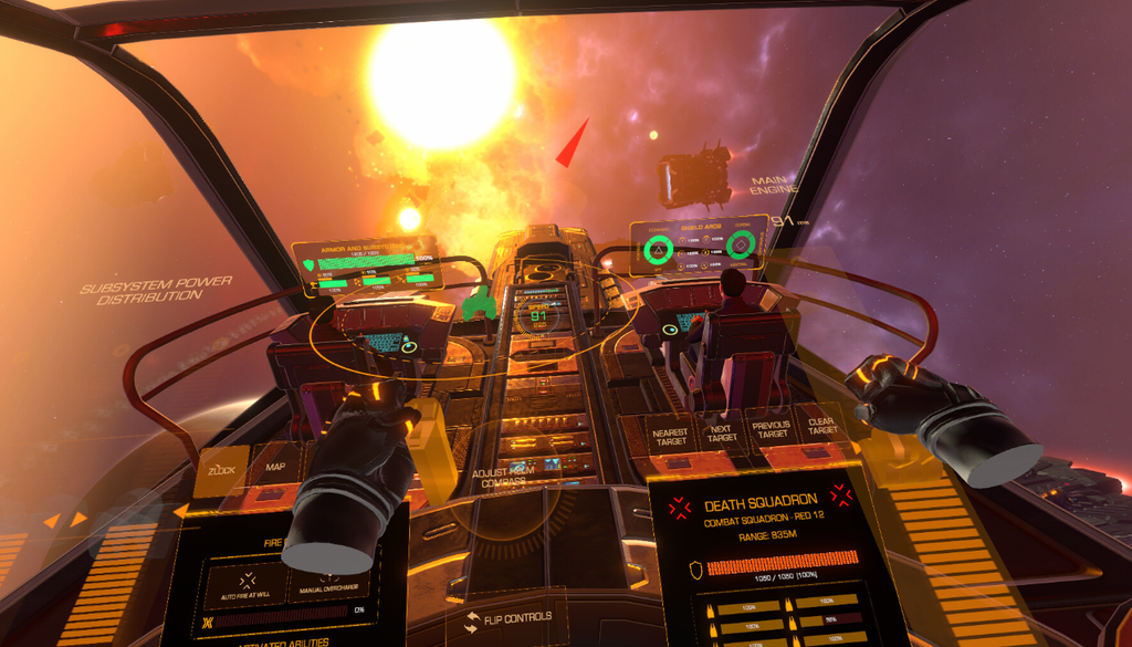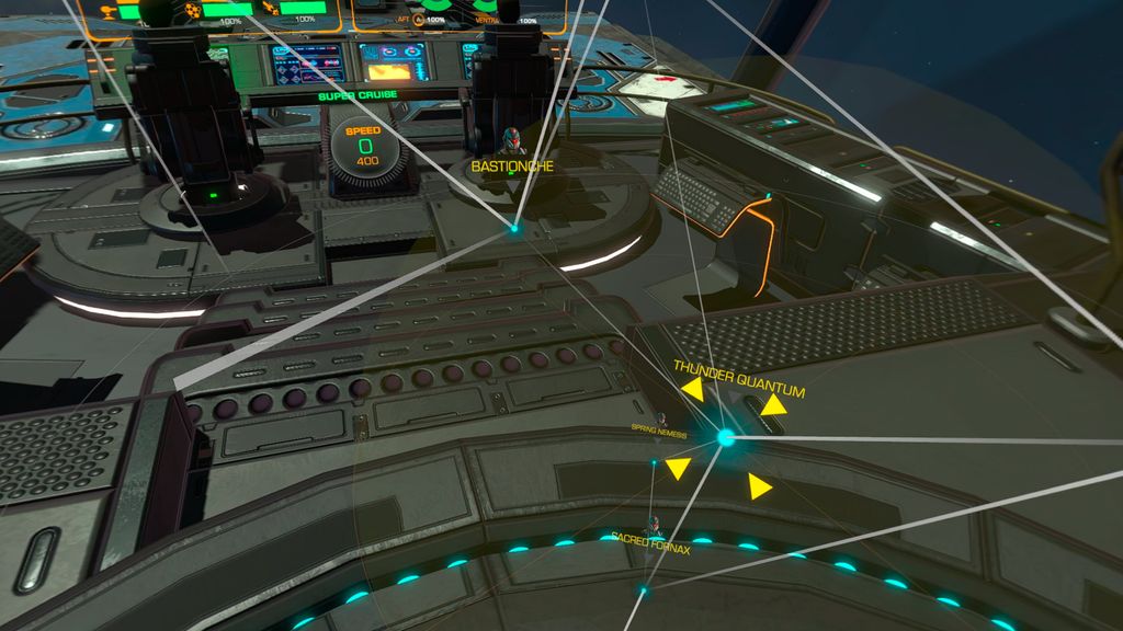 Le vaisseau se commande directement depuis le pont. Vous êtes sur le fauteuil du commandant et vous donnez vos ordres à l'équipage qui s'exécute, commande vocales incluses. Casque VR et clope au bec, on se sent amiral.