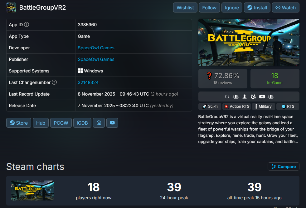 Déjà c'est de la VR, donc dès le départ le nombre de joueur est réduit de 90% . Ensuite c'est un jeu hybride dans lequel on commande des unités dans une bataille spatiale, et où on participe en même temps au combat. Les jeux comme ça sont rare et restent méconnus , à part quelques uns qui ont réussi à se batir une fanbase solide dans une communauté de niche, comme Mount And Blade.