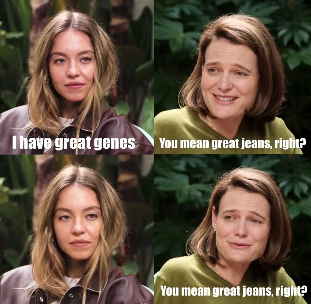 Le regard demi-endormi de l'icône Sydney Sweeney, refusant sans forcer de se soumettre à l'idéologie dominante, face à une journaliste névrosée qui d'évidence, fait plus que son âge, dit tout des hiérarchies naturelles entre êtres humains.