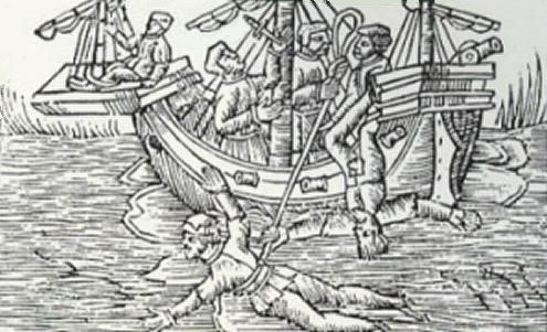Continuons avec une forme de châtiment corporel utilisé dans les marines militaires jusqu'au début du XIXème siècle. On disait "donner la cale" pour punir l'incitation à la désobéissance. Une pratique spectaculaire pour montrer l'exemple à l'équipage dont une grande partie participait à ce supplice. Il existe plusieurs types de cales. La première, la cale ordinaire où la victime est attachée à une corde puis hissée en haut de la vergue du grand mât par l'équipage. Au commandement, la victime est lâchée et peut rester un certain temps sous l'eau. L'opération peut être répétée plusieurs fois. Même si le condamné a des chances de survie, la plupart du temps il meurt assommé ou noyé. Vient ensuite la cale sèche, basée sur le même principe sauf que la chute de la victime est stoppée nette avant de toucher l'eau. Elle a alors les bras désarticulés ou arrachés et est abandonnée en pleine mer. Enfin, la grande cale où le condamné est ligoté à un cordage qui passe d'un bord à l'autre sous la coque du navire. Les membres de l'équipage tirent le cordage pour le tirer de l'autre côté en le faisant passer sous la quille. Ces techniques étaient employées par les Hollandais et les Français depuis le XVIème jusqu'à son abolition en 1853 mais on retrouve des témoignages de son utilisation par les Grecs en 800 avant J.C pour l'infliger aux pirates qui infestaient la mer Égée.