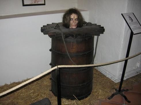Aussi connue sous le nom de scaphisme, cette torture quoique peu répandue, était particulièrement cruelle. La victime était mise dans un tonneau d’où seule la tête ressortait. Ne pouvant uriner et déféquer ailleurs, le tonneau finissait par se remplir, attirant les insectes et vers. Ceux-ci finissaient par s’attaquer à la chaire de la victime, qui mourrait la plupart du temps de diverses infections.