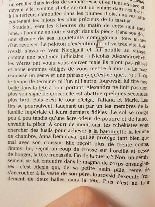la femme de ménage Anna Demidova> ils lui tirent dessus, elle se relève et déclare "merci mon Dieu, tu m'as sauvé", les bolchéviques lui mettent 30 coups de bayonnette