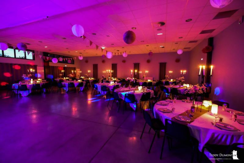 Un grand BUFFET organisé par un TRAITEUR a été érigé sur de longues tables recouvertes de nappes blanches en papier , des stroboscopes envoient de la lumière partout dans la salle campée par 85 personnes
