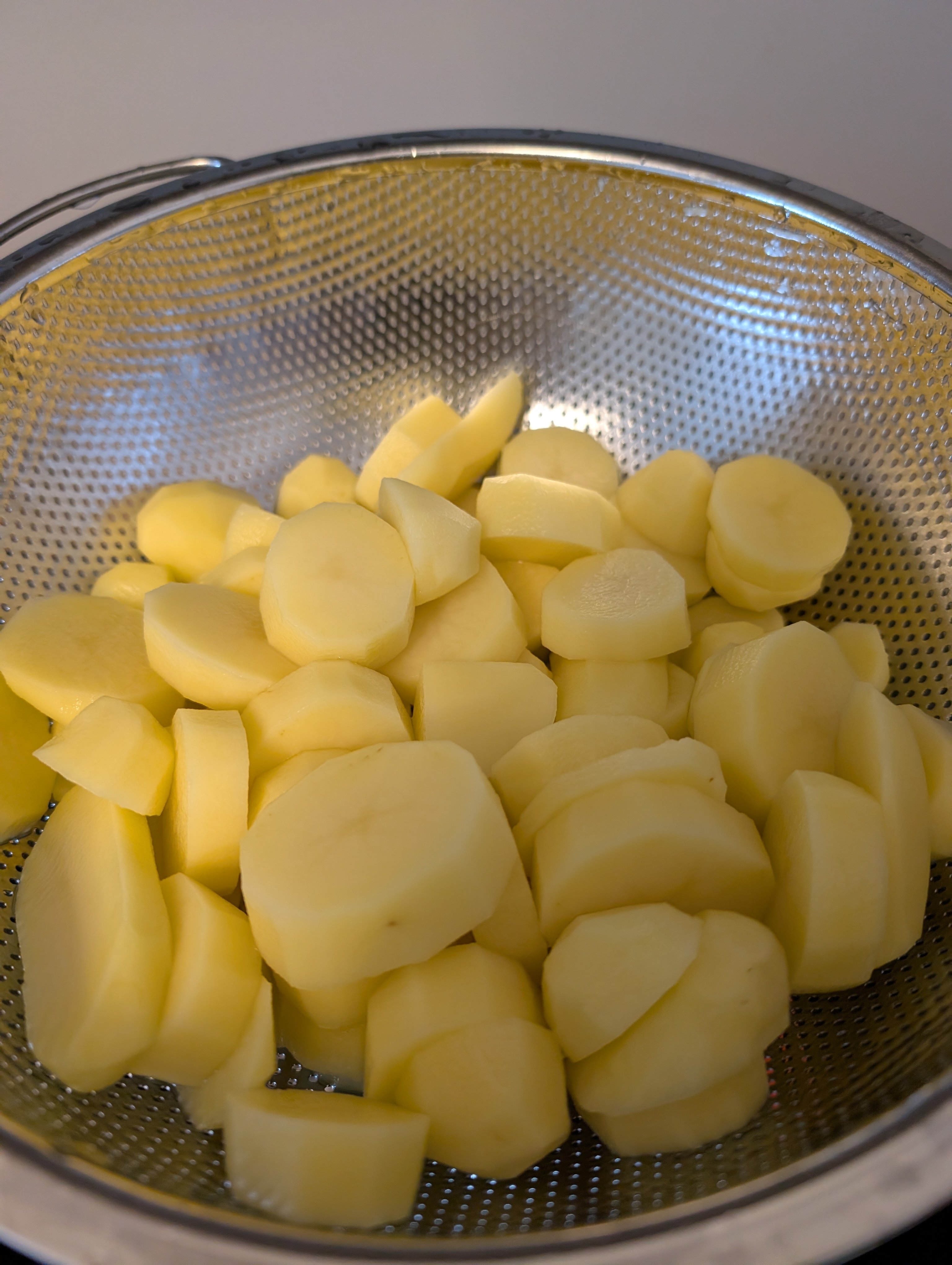 Vous pouvez commencer par éplucher et couper en tranches des pommes de terres