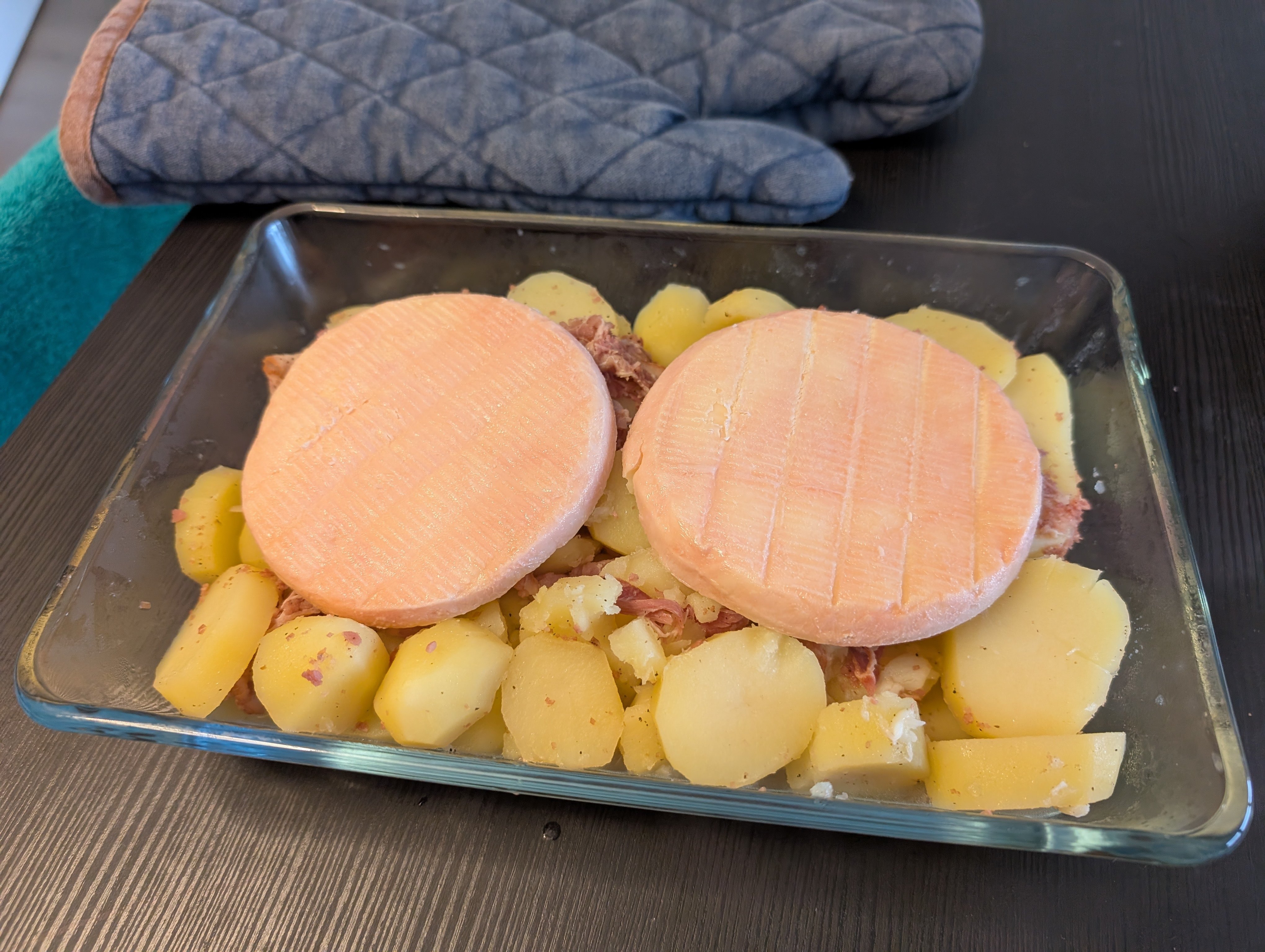 Après vous versez tout ça dans un plat à four et vous mettez un munster coupé en deux par dessus