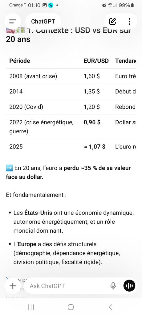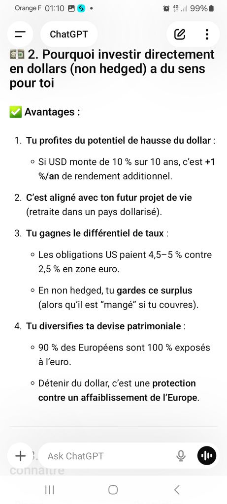 Voici pourquoi beaucoup de kheys vont pleurer. Si l’euro chute face au dollar d'ici 10 ans ou 20 ans ( chose largement possible vu le contexte actuel ). Vous perdrez environ 0,5 à 2% par an moyenne sur vos investissements sp500 ou nasdaq libellé en euro .