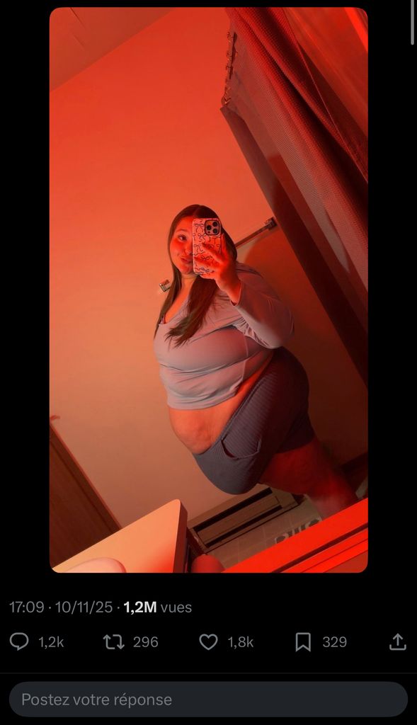 La société cancer woke, va la brosser dans le sens du poil en lui disant qu'elle est parfaite comme elle est. Ces mêmes hypocrites qui refuseraient un tel physique pour eux même. Quand aux gens concerné par le même problème et qui ose la rassurer, vivent un calvaire comparable sans être réellement aidé.