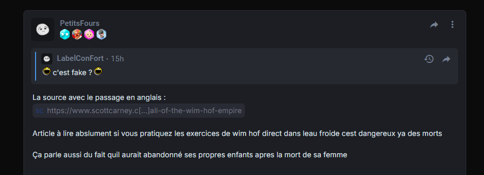 Sur la première page de ce topic, tu rages à plusieurs reprises parce que Wim Hof aurait soi-disant abandonné son fils (pour répondre à ton PS: avant même que je ne réponde).