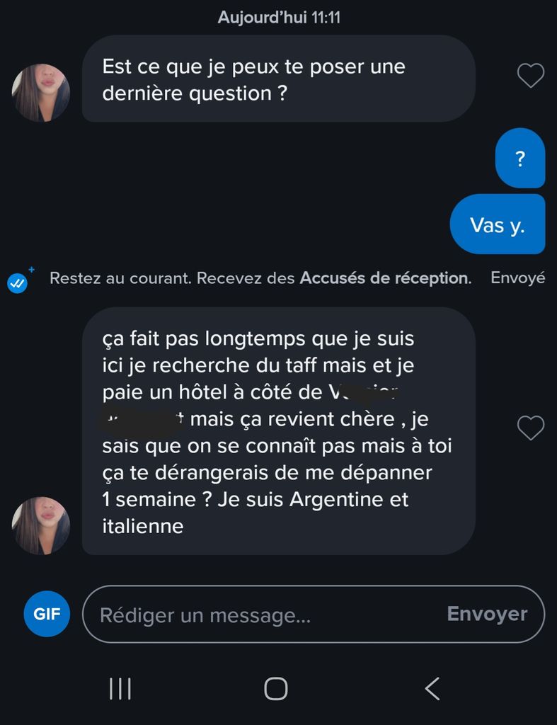 Ma carte bleu est bloquée en Andorre je suis bloquée au péage à la frontière. Tu peux me virer 50 euros je te rends 100 demain