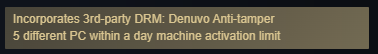 Je peux comprendre et c'est totalement dans leur droit de protéger leurs œuvres, même si dans mes souvenirs un DRM comme Denuvo coûte assez chère. Mais bon ça craint, surtout quand les devs ne proposent une version démo de leur jeu