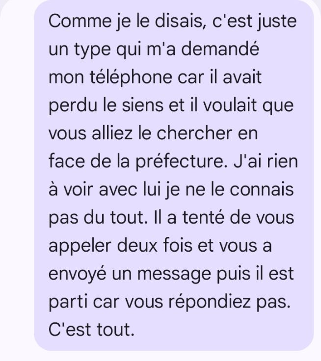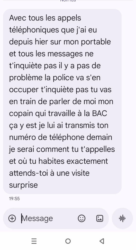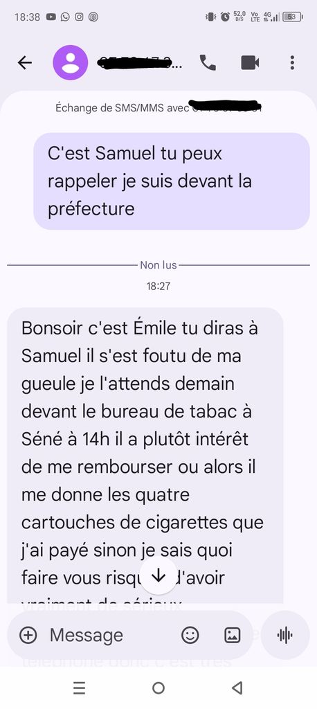 Bonsoir c'est Émile tu diras à Samuel il s'est foutu de ma gueule je l'attends demain devant le bureau de tabac à Séné à 14h il a plutôt intérêt de me rembourser ou alors il me donne les quatre cartouches de cigarettes que j'ai payé sinon je sais quoi faire vous risquez d'avoir vraiment de sérieux problèmes j'ai ton numéro de téléphone donc c'est très facile pour moi d'avoir ton adresse j'ai des amis qui travaillent dans la police vous risquez sérieusement d'avoir de sérieux problèmes très facile avec ton numéro de téléphone donc demain 14h devant le bureau de tabac avec les quatre cartouches un conseil que je lui donne je vous laisse 48 heures et ensuite je vais directement à la police il va avoir sûrement des représailles nous vous inquiétez pas attention à vous