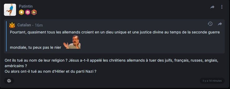 Pourtant, quasiment tous les allemands croient en un dieu unique et une justice divine au temps de la seconde guerre mondiale, tu peux pas le nier