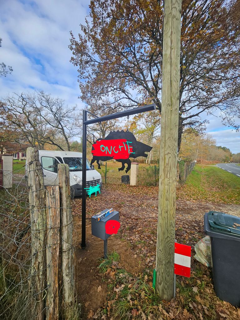J'ai fabriqué une potence avec un sanglier en tôle pour un de mes frères, c'est pour que les livreurs trouve plus facilement l'adresse.