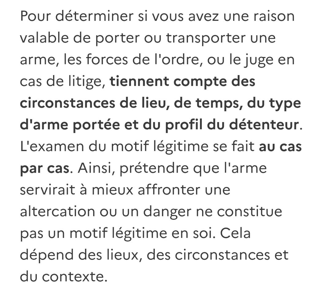 le mot important a retenir c'est "en soi" une arme de défense est plus ou moins tolérable selon son type + circonstances