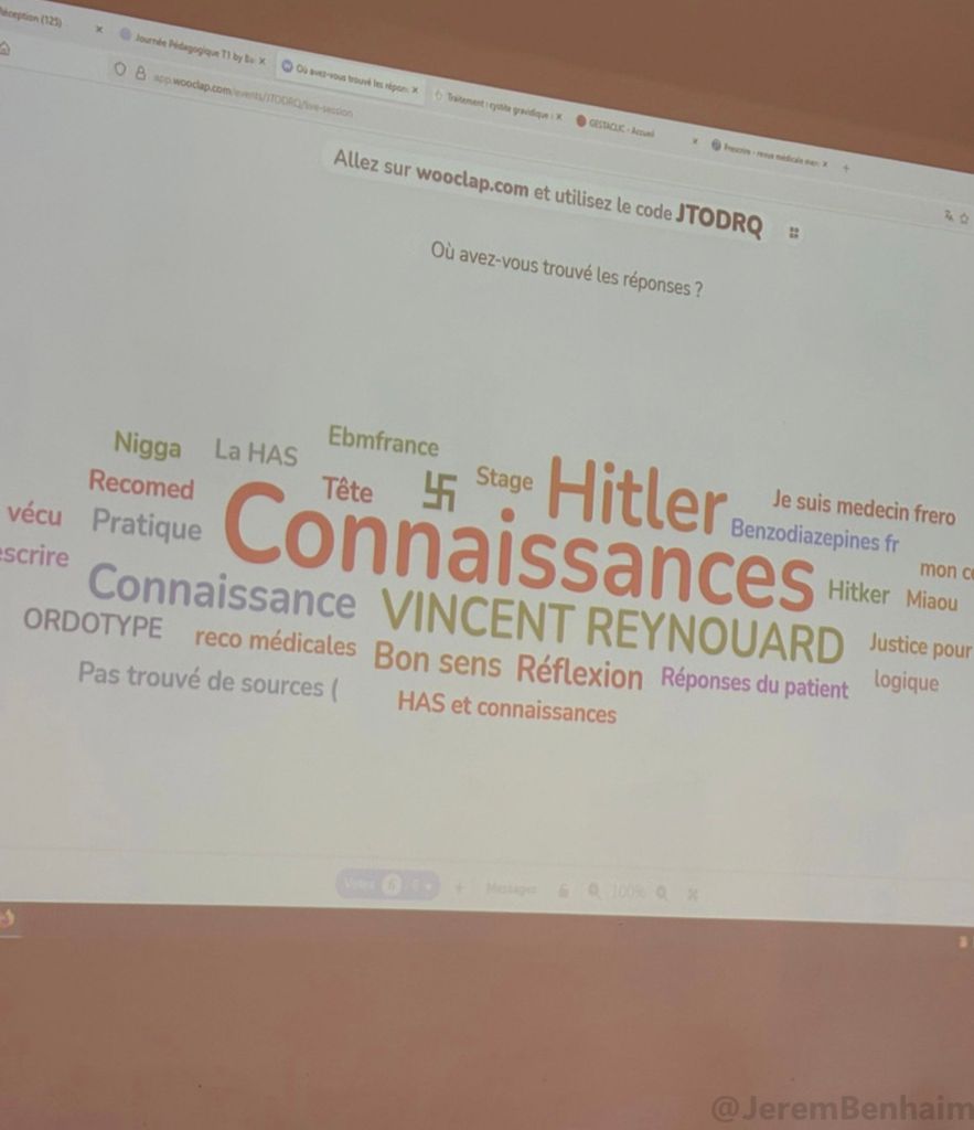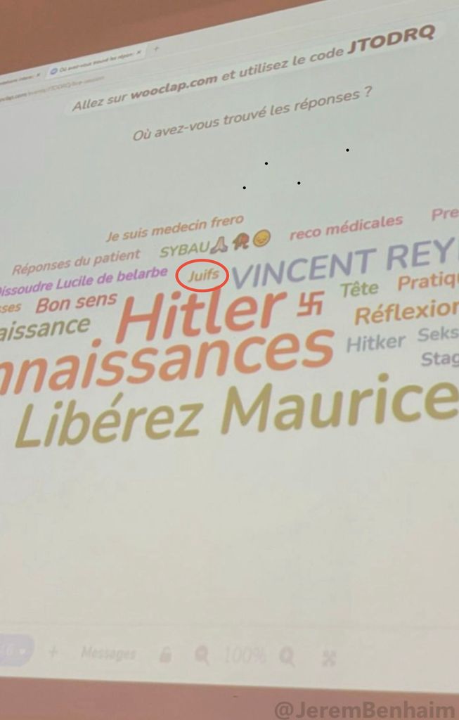 Hier matin à la Faculté de médecine de la Sorbonne, lors d’un cours de médecine générale réunissant environ 120 internes qui devaient répondre à une question sur les infections urinaires, en indiquant également sur quelles sources ils s’étaient appuyés pour y répondre, certains d’entre eux ont osé écrire « Hitler » ou le symbole de la croix gammée !