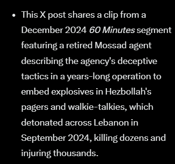 Ce post X partage un extrait d'un segment de 60 Minutes de décembre 2024 mettant en vedette un agent à la retraite du Mossad décrivant les tactiques trompeuses de l'agence au cours d'une opération de plusieurs années visant à intégrer des explosifs dans les téléavertisseurs et les talkies-walkies du Hezbollah, qui ont explosé à travers le Liban en septembre 2024, tuant des dizaines et en blessant des milliers.