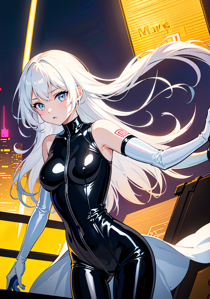 Peau blanche cheveux blancs en tenue latex noire je vous prie cher auteur