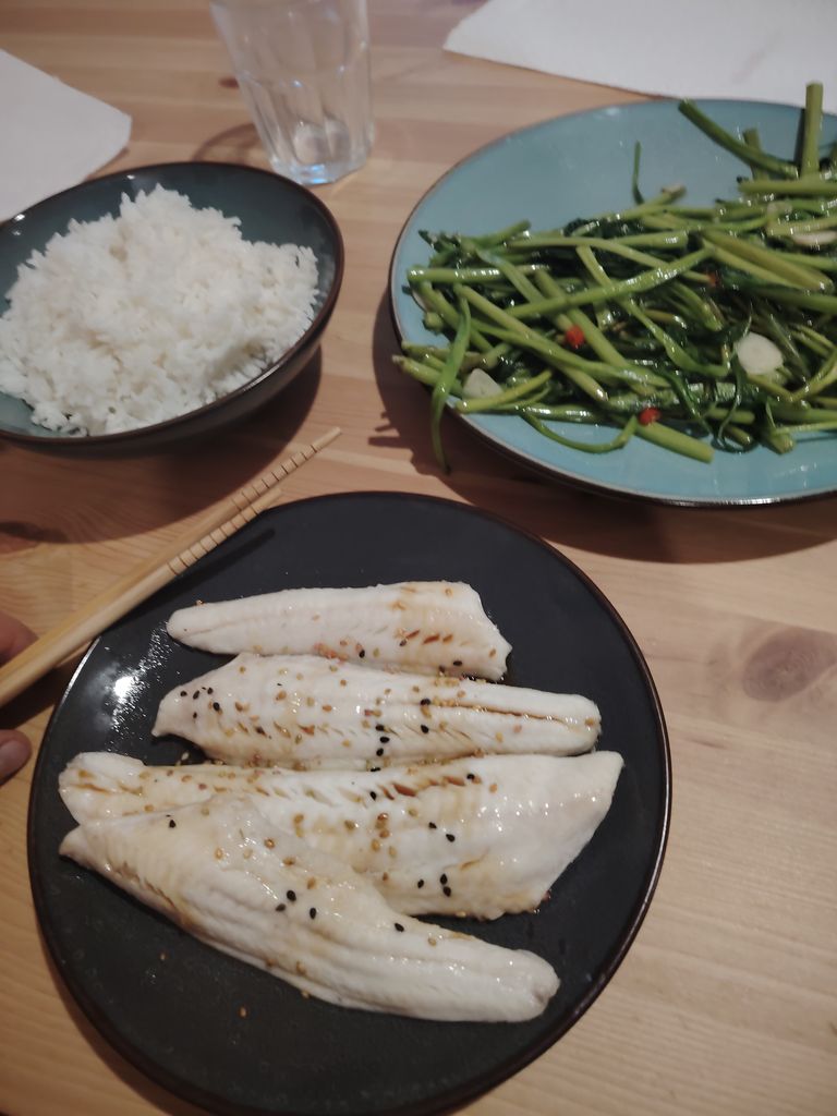Filets de vive au citron cuits à la vapeur, épinard d'eau sauté au piment et à la l'ail avec du riz khamalis, un riz premium du Cambodge
