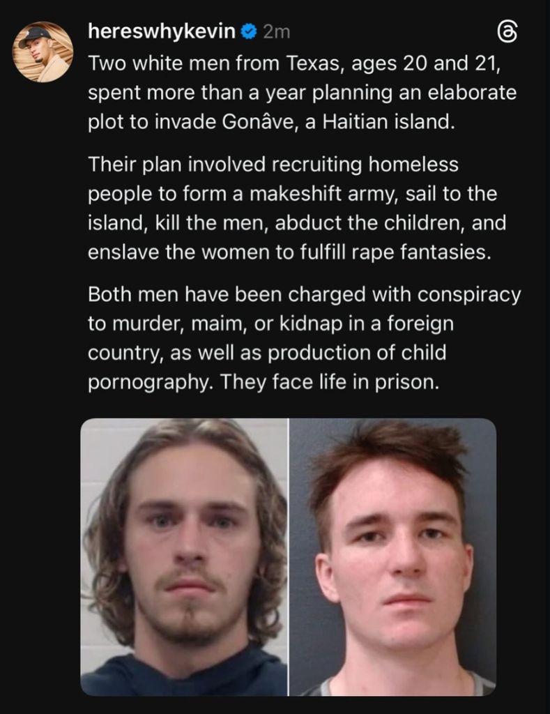 “ Deux hommes blancs originaires du Texas, âgés de 20 et 21 ans, ont passé plus d'un an à élaborer un plan complexe pour envahir Gonâve, une île haïtienne.