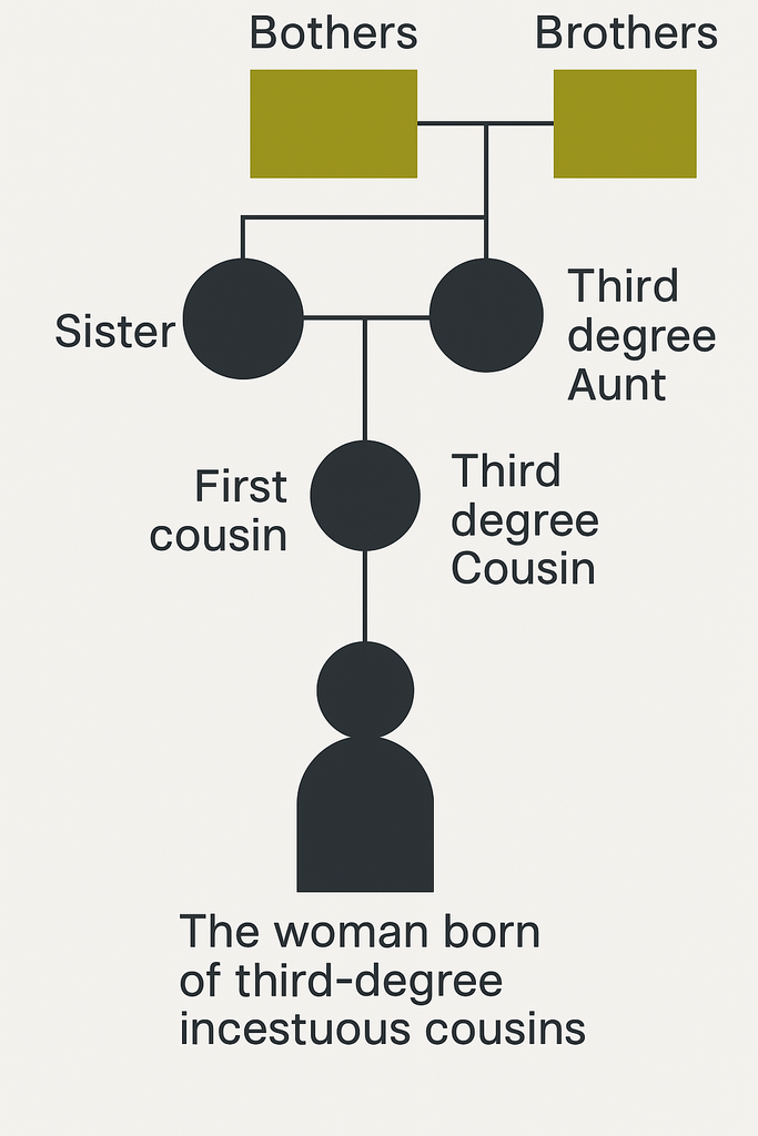 Donc, si je comprends bien, elle est la fille de son cousin et de sa tante, qui étaient eux même frère et soeur au 3e degré du côté de l'oncle maternelle ?